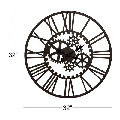 Add character to your industrial-themed interior home design with this black gears analog wall clock displayed on your pastel or natural-toned wall. Requires 1 AA battery. Battery not included. This item ships in 1 carton. Roman numerals clock face in black. The clock mechanism runs silent. Round wall clock has exposed gears, black-colored clock hands, and easy-to-read Roman numerals. Can be hung vertically using the keyholes on the back; nails and screws not included. Suitable for indoor use only. This item ships fully assembled in one piece. This is a single black colored oversized wall clock. Industrial style.