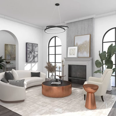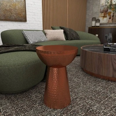 - •Hammered metal accent table sports a glossy copper finish with brass undertone