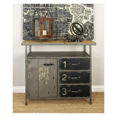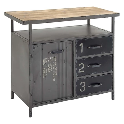 - Designed with rugged charm and edgy allure, where metal finishes and raw materials unite to create an urban aesthetic that showcases your artistic expressionIndustrial storage unit features a sturdy construction of iron and fir woodMetal cabinet storage carries natural wood brown top with gunmetal gray structure and black distressingRectangular metal dresser features open midsection shelf with a combination of spacious cabinet and drawers, curved handle bars for easy open and painted with repurposed-style script in white with heavily distressing designThis item measures 36L x 16.75W x 32.38H inches, and weighs 41.50 lbsThis distressed file cabinet carries a gray exterior and a rectangle silhouetteWipe clean with a dry clothThis distressed corner cabinet is formed by hammered metal sheets welded together to hold a wooden tabletop and pull-out drawers