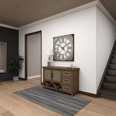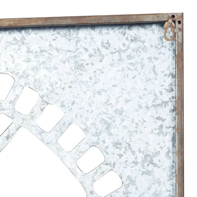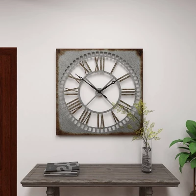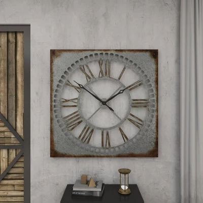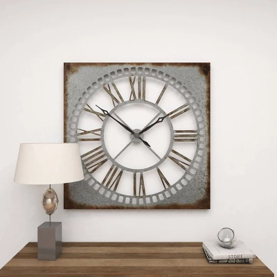 This timepiece will be the centerpiece of your room’s wall and is perfectly sized for your living room, bedroom, or kitchen. Requires 1 AA battery. Battery not included. This item ships in 1 carton. Roman numerals clock face. The clock mechanism runs silent. Large square metal wall clock with Roman numerals. Can be hung vertically using the keyholes on the back; nails and screws not included. Suitable for indoor use only. This item ships fully assembled in one piece. This is a single gray colored oversized wall clock. Farmhouse style.