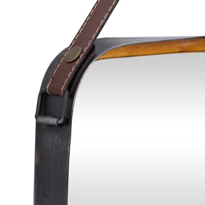 - •Hanging wall mirror features a brown faux leather belt strap and a gold-finished inner frame design