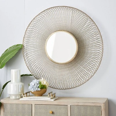 This round gold wall mirror carries a playful spiral design best appreciated against a white background, on top of a console dresser inside a modern-themed interior. This item ships in 1 carton. Can be hung vertically using the keyholes on the back; nails and screws not included. Suitable for indoor use only. This item ships fully assembled in one piece. Made in India. This is a single gold colored entryway mirror. Modern style.