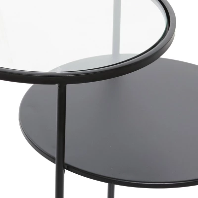 Bring a finishing touch to your home with an inviting appeal with this beautifully crafted accent table. A compact friendly table providing you with additional surface storage space any where in your home. Black metal and glass accent table will blend seamlessly into your sophisticated style of home next to a dark leather sofa. This item ships in 1 carton. Varying heights allow for leveling of table top exhibits. Suitable for indoor use only. Item has maximum weight limit of 100 lbs.. Modern style.