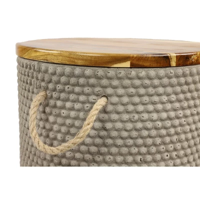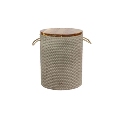 - Gray end table with storage showcases lightweight and durable polycement in its cylindrical frame and round acacia wood tabletop and receptacle cover