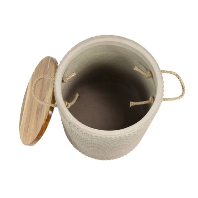 - Round patio accent table features pearl textured on the exterior complemented with wooden top that lifts to reveal storage inside and 2 rope side handles for easy transport