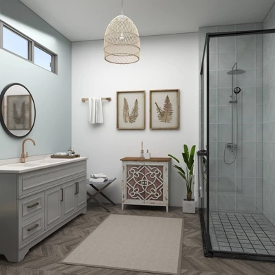 - •Carved wood cabinet carries a distressed whitewashed and brown wood finish with bright white knob handles