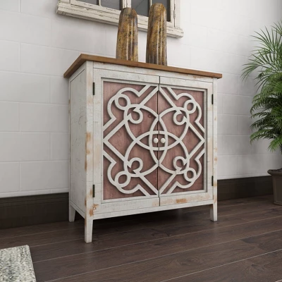 - •White wood storage unit features spacious cabinet with carved relief trellis on each door and complemented with round knob for handles