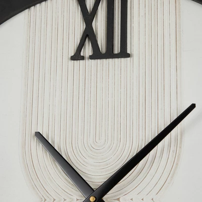 - Features a carved pattern on the white face of the clock