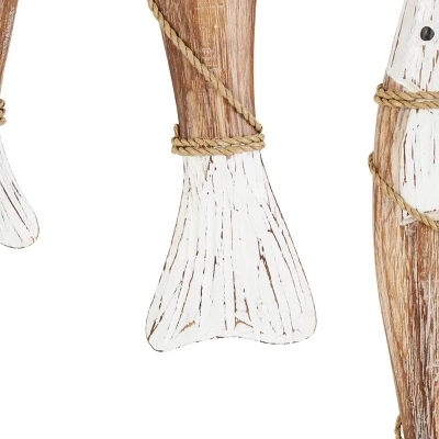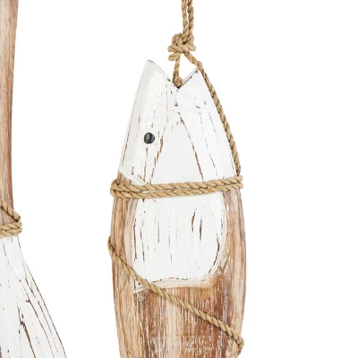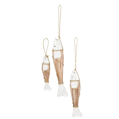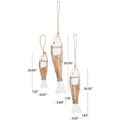 - This wood set of 3 wall decors features asymmetrical fish shapes suspended from wrapped jute ropes, encapsulating the essence of marine life