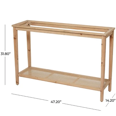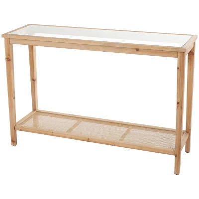 - A sturdy natural wood construction makes up the framework of this console table, with a rattan lower shelf and glass top