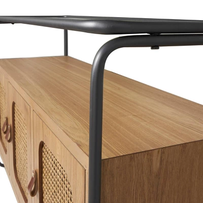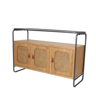 - This brown 3 door console table features a stylishly finished in a rectangle shape with cane front doors and gray metal frame