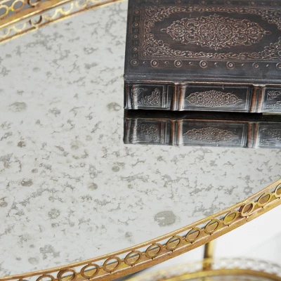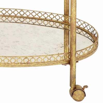 - •Metal bar cart showcases a textured gold finish with antique mirror glass