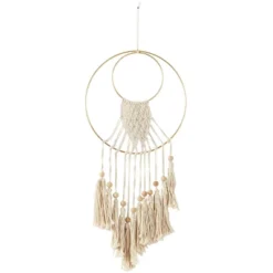 Cotton Macrame Handmade Wall Decor With Wood Beads And Gold Circular Frame Cream – Olivia & May
