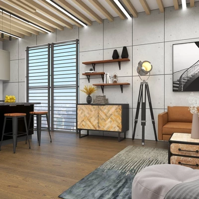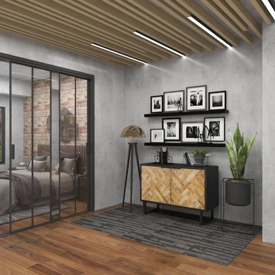 - •Contemporary storage unit features geometric wood paneling on each door with L-shaped bars for handles, and high under clearance for easy cleaning
