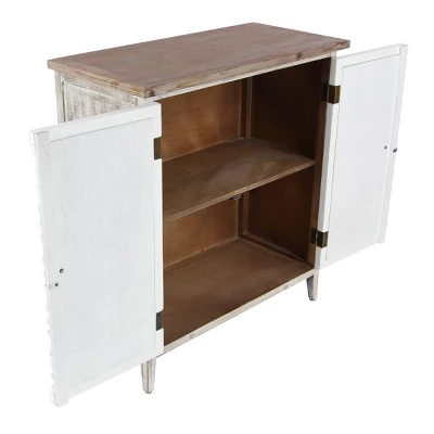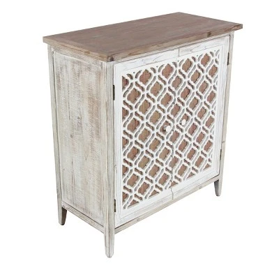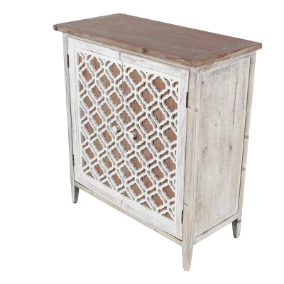 - Features 2 cabinet doors with carved lattice pattern overlay and round knob handles