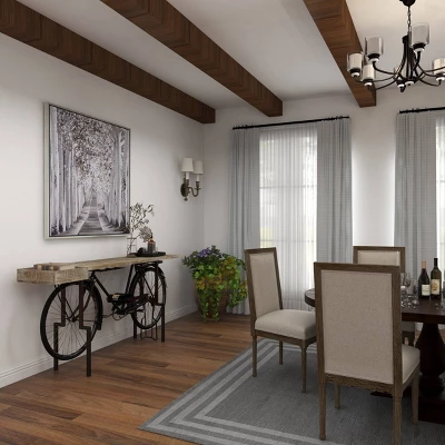 - •This rustic console table features a long wooden top with a box container and a bike-shaped leg with 2 wine bottle holders