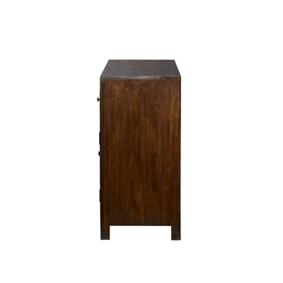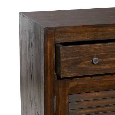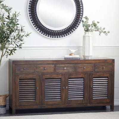 Bring a finishing touch to your home with an inviting appeal with this expertly crafted buffet sideboard. A stylish way to keep you organize and your belongings safe and protected. Such details make it a piece of accent furniture for displaying tabletop decorations, mini appliances, and framed pictures. Designed with felt or rubber stoppers at the base that prevent scratching furniture and table tops, as well as sliding around. This brown rectangular buffet features 4 cabinet doors with cabinet interiors that measure 16”L x 14”W x 8.75”H and 29.37”L x 14”W x 8.25”H. This item ships in 1 carton. Brown buffet features 5 drawers with 25 lbs weight limit. Due to the handmade nature of this item, no two will be alike, there will be slight differences in shape, size, and color. Suitable for indoor use only. Maximum weight limit is 125 lbs. Made in Indonesia. This is a single buffet. Wood buffet features a single shelf. Rustic style.