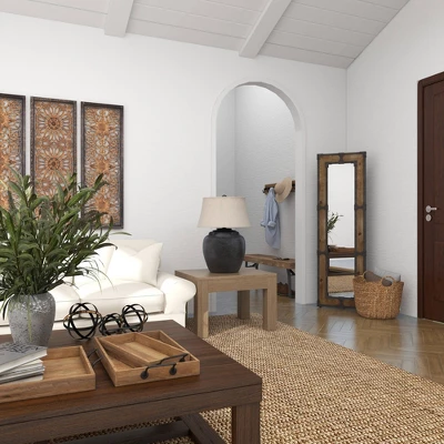 - •Wood and metal dressing mirror features a rustic style rectangular frame with rivet-accented corners
