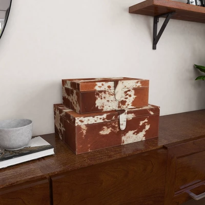 Perfect way to add depth and texture to your surface space with this compact and discreet box. A practical yet stylish upgrade that instantly elevate the look of your room. Use these leather jewelry boxes together or separately to store personal belongings in the boudoir or bedroom or showcase table displays in the living room. Designed with felt or rubber stoppers at the base that prevent scratching furniture and table tops, as well as sliding around. This item ships in 1 carton. Easy snap closures covered in cowhide. Leather box makes a great gift for any occasion. Due to the handmade nature of this item, no two will be alike, there will be slight differences in shape, size, and color. Suitable for indoor use only. This item ships fully assembled in one piece. Leather and hair on hide are natural products, and therefore no two will be alike. There may slight variations in pattern, natural blemishes, colors, and overall aesthetic of the product. Made in India. This brown colored decorative keepsake box comes as a set of 2. Glam style.