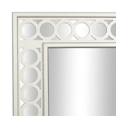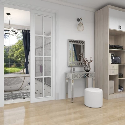 - •Silver vanity table and mirror set features circular cut out overlay the mirror paneling structure with one drawer for additional storage space