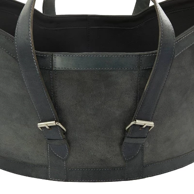 - •Leather in a deep blue hue is sewn into two durable storage baskets