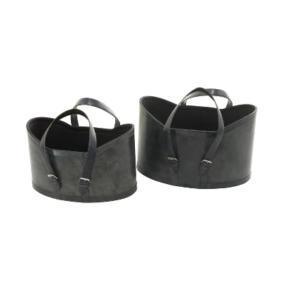 - •Riveted die cut handles and a wide rectangular storage space makes these 2-set leather baskets a chic and convenient choice