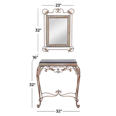 Bring a finishing touch to your home with an inviting appeal with this console table with mirror. Useful and elegant, console tables are more than just a place to throw your mail. Create a ravishing furniture pairing with this console table and wall mirror set design and place them against light-toned backgrounds for a romantic visual delight. Designed with felt or rubber stoppers at the base that prevent scratching furniture and table tops, as well as sliding around. This item ships in 1 carton. Can be hung vertically using the keyholes on the back; nails and screws not included. Suitable for indoor use only. This item ships fully assembled in one piece. Maximum weight limit is 100 lbs. This bronze colored entryway table with mirror comes as a set of 2. Traditional style.