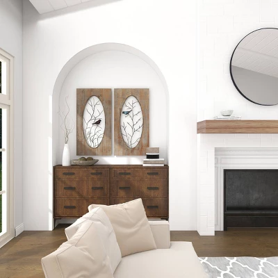 Create a balanced space in the most creative way with this expertly crafted wall decor for captivating focal point. Showcase your personality and turn your walls into an art gallery with this captivating wall decor. Get that year round autumn vibe with these rustic wood birds panel decor displayed on your vanilla or pastel-painted. This item ships in 1 carton. Each wall panel features oval cutout with bird on branch iron sculpture. Can be hung vertically using the D-rings on the back; nails and screws not included. Suitable for indoor use only. This item ships fully assembled in one piece. This brown colored wall sculptures comes as a set of 2. Rustic style.