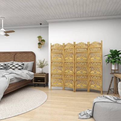 This 4-panel room divider is see-through because of the traditional carvings. Still, it can provide privacy with the addition of curtains or Japanese paper. Designed with felt or rubber stoppers at the base that prevent scratching furniture and table tops, as well as sliding around. This item ships in 1 carton. This item features foil detailing that is hand-applied by artisans with adhesive and thin layered flakes of metallic foil to achieve the distressed metallic effect. This high-end technique is intricately applied to each piece to add dimension and elevate the style. Due to the handmade nature of this item, no two will be alike, and there will be slight differences in color and foil pattern. Suitable for indoor use only. This item ships fully assembled in one piece. Made in India. Item features 4 panel screens. This is a single gold colored folding panel partition. Traditional style.
