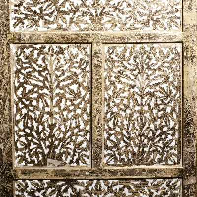 Add beauty and depth to your endearing living spaces as you divide your areas with this 4-panel wooden divider that blends well on light and neutral-toned backgrounds. This item ships in 1 carton. Due to the handmade nature of this item, no two will be alike, there will be slight differences in shape, size, and color. Suitable for indoor use only. This item ships fully assembled in one piece. Made in India. Item features 4 panel screens. This is a single gold colored folding panel partition. Traditional style.
