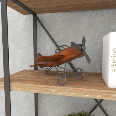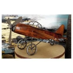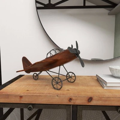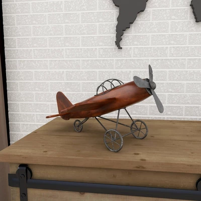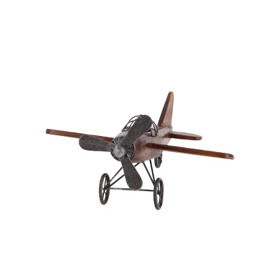Be reminded of the early days of flight with this vintage style brown wood airplane sculpture in your classics inspired home. This fir wood constructed sculpture features an old propeller aircraft design in brown finish. The fuselage is crafted from the strong fir wood while the pilot roll cage, propeller, and wheel sets are made from iron. The overall aesthetic of this sculpture is distressed in nature, perfect for adding that vintage vibe in your home when displayed on shelves, desks, or tables. Get nostalgic with this vintage airplane miniature displayed on your console, coffee, or office table. Wipe clean with a dry cloth. Suitable for indoor use only. Vintage inspired. This item comes shipped in one carton.