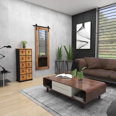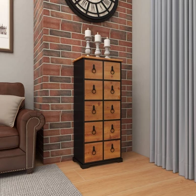 The top section of this tall drawer cabinet can be a tabletop surface for displays or a desk fan. Add a unique stylish storage to your living room, hallway, or home office with this chest. Beautifully crafted with durable structure and design for a long lasting enjoyment to keep your space free of clutter. 10 pull-out drawers with 7″L x 10″W x 7″H interiors. Suitable for indoor use only. Maximum weight limit is 50 lbs. Rustic design.