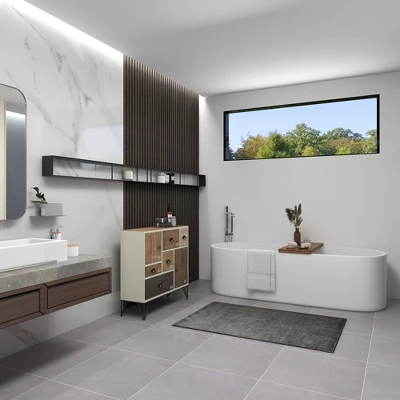- •Modern cabinet features a smooth white and brown wooden finish and a black iron finish