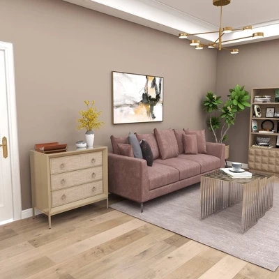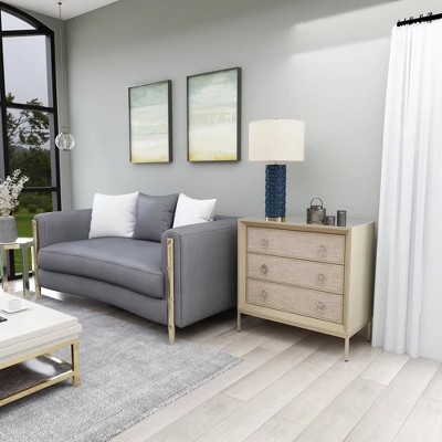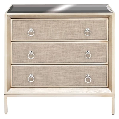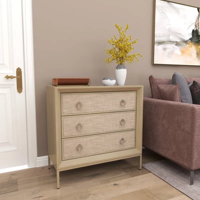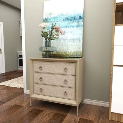 Beautifully crafted with durable structure and design for a long lasting enjoyment to keep your space free of clutter. A spacious piece of furniture that can instantly transform the look of any room in your home. Create an elegant display with this large upholstered dresser and decorate it with a metal object on top of books next to a large ceramic vase. This item ships in 1 carton. Beige chest features 3 drawers with 25 lbs weight limit. Suitable for indoor use only. Maximum weight limit is 25 lbs. This is a single chest. Glam style.