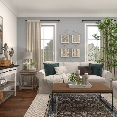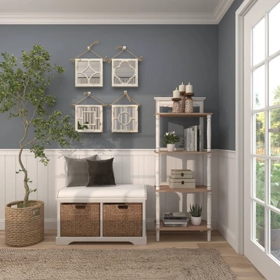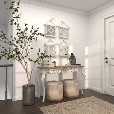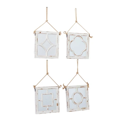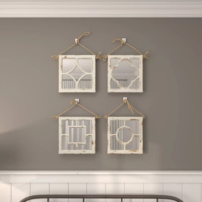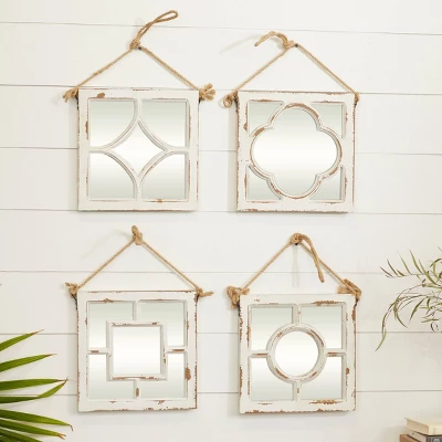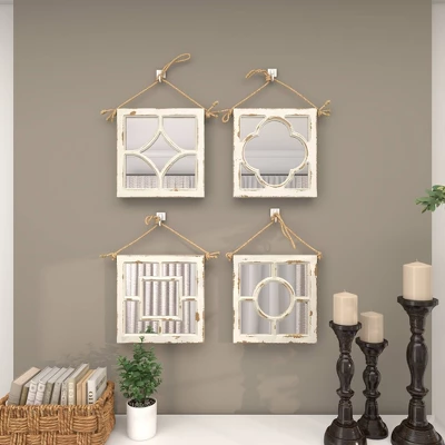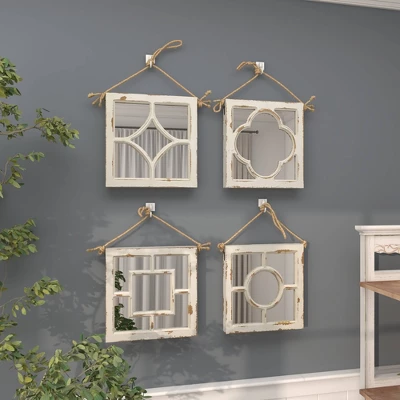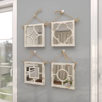 These hanging square wall mirrors have an delicate charm that makes them ideal as decor pieces for the living room, the entryway, the kitchen, and the bedroom. This item ships in 1 carton. Can be hung vertically using the jute rope; nails and screws not included. Suitable for indoor use only. This item ships fully assembled in one piece. This white colored entryway mirror comes as a set of 4. Vintage style.