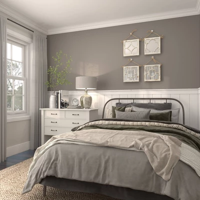 - •Features square wall mirrors in a distressed white wood finish