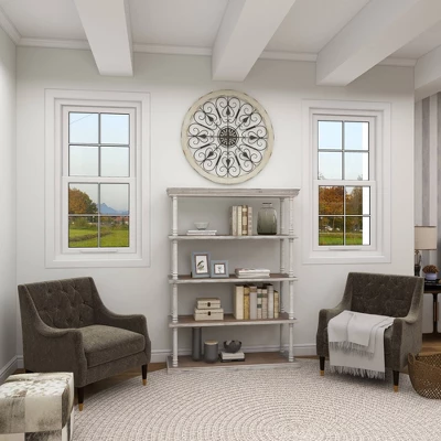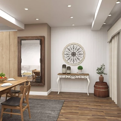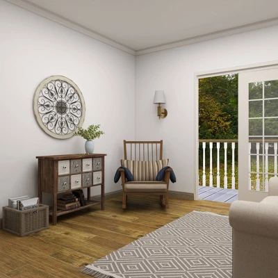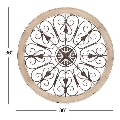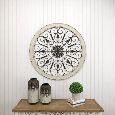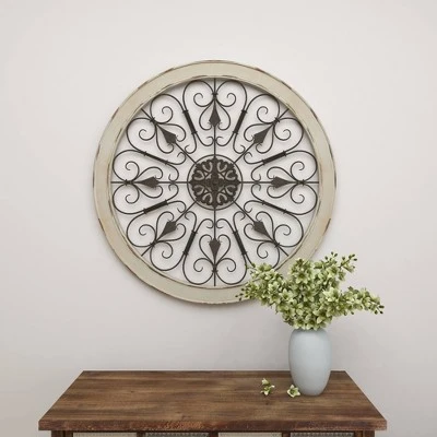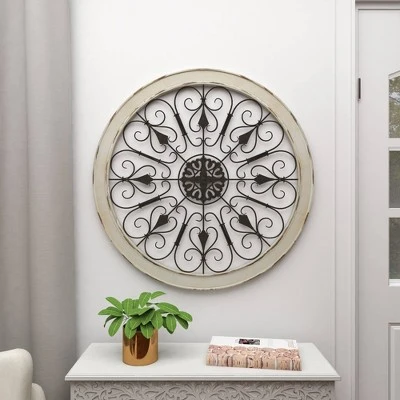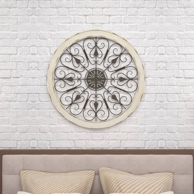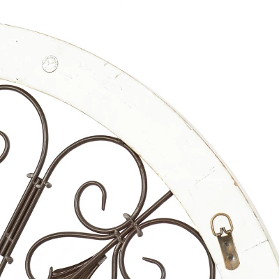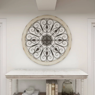 Display in your foyer, living room, or dining room as a centerpiece near hanging or potted plants for a country cottage feel. This item ships in 1 carton. A large round wood and metal wall decor with scrollwork. Can be hung vertically using the D-rings on the back; nails and screws not included. Suitable for indoor use only. This item ships fully assembled in one piece. This is a single white colored wall sculptures. Farmhouse style.