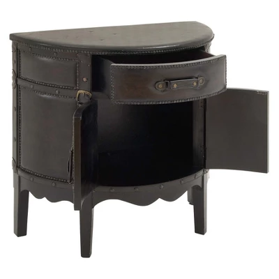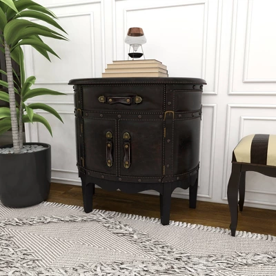This dark brown traditional cabinet provides you a perfect storage solution and offers a clean and comfortable living space. A practical yet stylish upgrade that instantly elevate the look of your room. Maintain a clutter free zone and stay organize with this chic cabinet. An accent furniture with 1 cabinet measuring 27.12”L x 14”W x 12.25”H. This semicircle cabinet features 1 drawer with 14.75”L x 13.62”W x 4.50”H measurements and 20 lbs. weight capacity. Suitable for indoor use only. This faux leather cabinet can support up to 100 lbs. Traditional style.