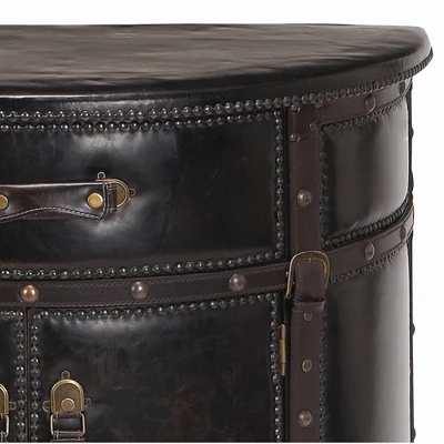 - This leathered semicircle cabinet sports a dark brown finish with brass metal accents