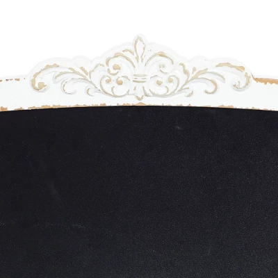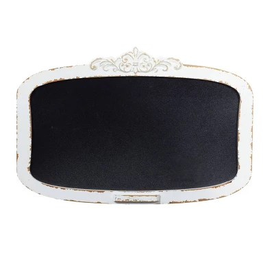 - This framed chalkboard has a trinket tray for chalk storage, designed with chipping detailing and lovely carved acanthus