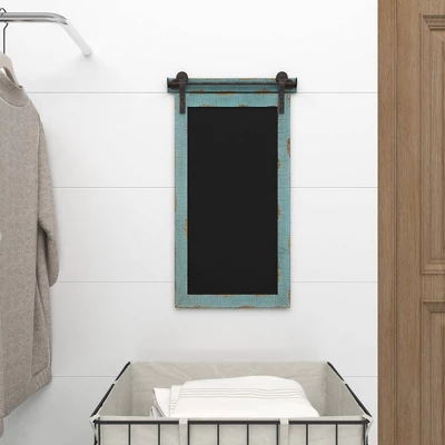 - •Industrial rusted iron hardware with natural warm gray blue wood and wood grain finish frame with blackboard panel