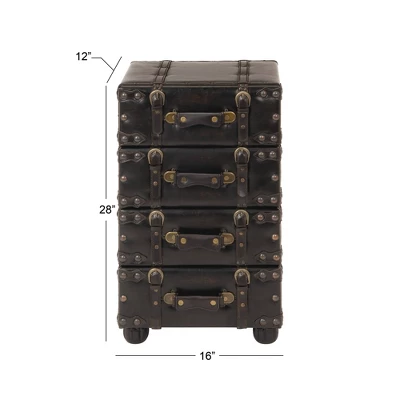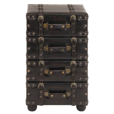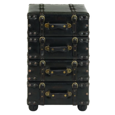 - •Black faux leather end table features a vintage inspired luggage drawers adorn with bolted detailing, rivet handles and buckle straps for a realistic look