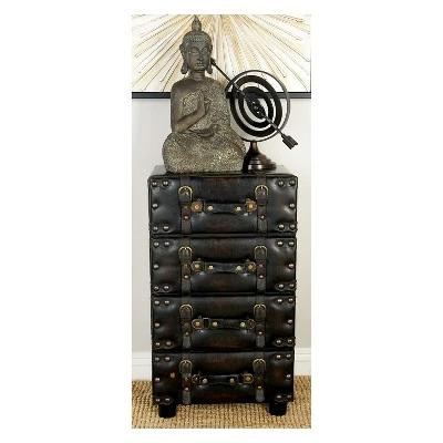 - •This chest drawer accentuates a rectangular frame with faux leather straps and riveted design