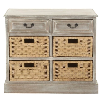 - •Storage unit features cabinet with 2 drawers with pull handles and 4 shelves with woven rattan baskets