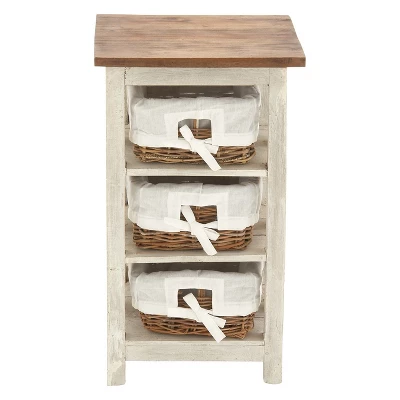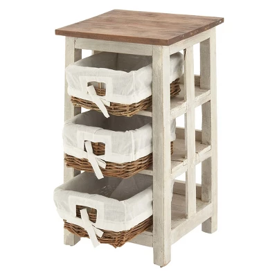 - •Rustic storage accent table is made of wood with rattan baskets and linen lining