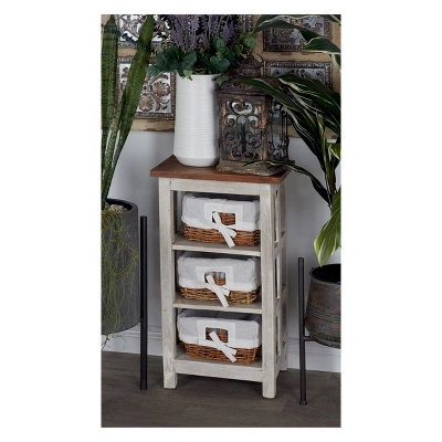- •Wood shelving unit features shelves that supports 3 brown wicker baskets with tied linen lining and cutout slots for easy carry and storage