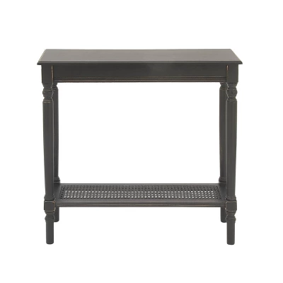- •Black narrow console table features a flat top, bottom shelf with rattan inspired weaving and supported by four pillar style legs for a simple yet classic design
