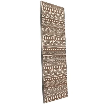- Natural brown wood panel has an intricate carved tribal pattern highlighted in a cream color