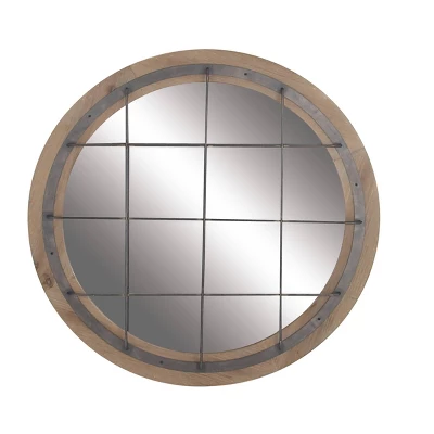 - •A decorative wall mirror featuring round wooden frame, clear reflective glass, and grid-patterned design