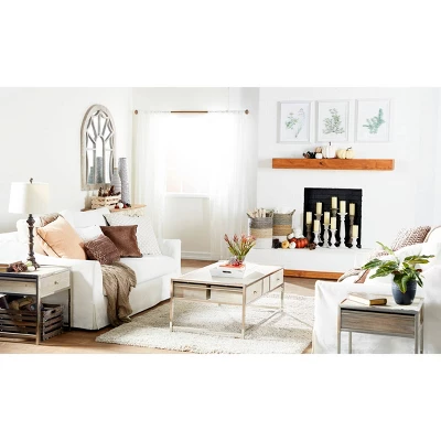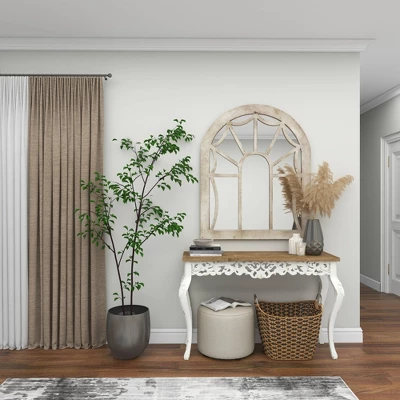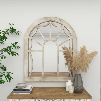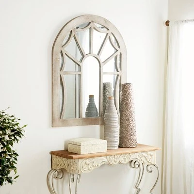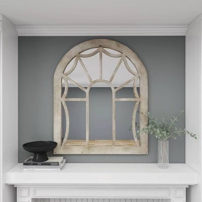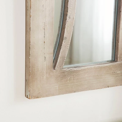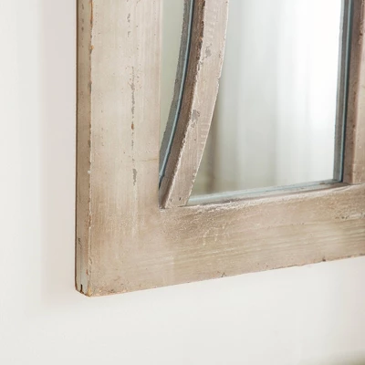 Add antiquated charm to your space with this large cathedral window mirror, featuring a distressed natural beige fir wood frame. The arched silhouette of this large wall mirror creates a cathedral window look with reflective mirror glass panels beautifully reflecting light. The distressing and neutral tone add both vintage and farmhouse style to this decorative mirror, while adding neutral versatile hues to complement any color palette or pattern. Easy and ready to vertically hang by hardware in back. Suitable for indoor use only. This item comes shipped in one carton.